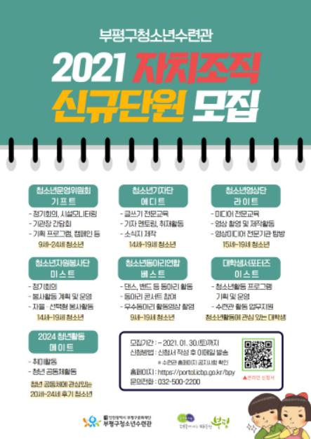 인천광역시 부평구 청소년수련관이 오는 30일까지 수련관의 2021년을 이끌어 갈 신규 단원을 모집한다.