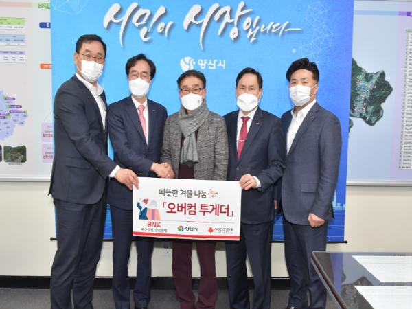 BNK금융그룹 희망나눔재단에서 지난 8일 따뜻한 겨울나기 ‘오버컴 투게더’(함께 극복하자) 생필품 240박스(금 1,200만원 상당)를 양산시에 전달했다.