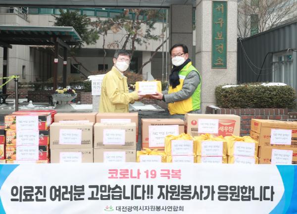 대전시자원봉사연합회(회장 김창섭)와 5개 자치구 자원봉사협의회는 11일 오전 11시 15개 선별진료소를 방문해 격려물품 등을 전달했다.