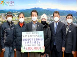합천군 대양면 안금리 윤재호 이장과 심찬회 새마을지도자 등 마을주민들이 지난 8일 합천군청을 방문하여 문준희 합천군수에게 농축산물가격안정기금 300만원을 전달했다.