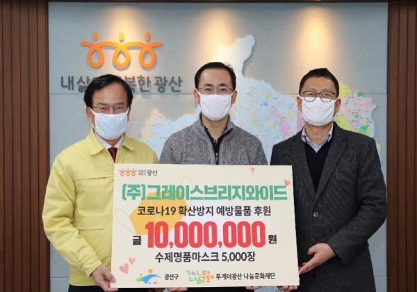 8일 서울 소재 ㈜그레이스브리지와이드가, 김미영 광산구의회 의원의 소개로, 코로나19 확산 방지를 위해 써달라며 1,000만원 상당의 마스크 5,000장을 광산구에 기부했다.