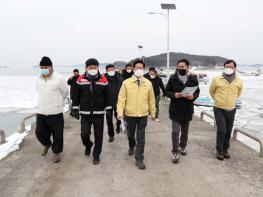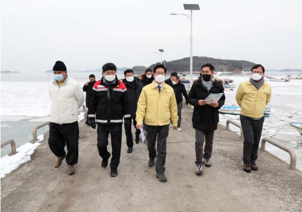 영하20℃를 밑도는 한파에 따른 저수온으로 수산물 피해 발생 우려가 높은 가운데 발걸음을 옮긴 양 지사는 가로림만 결빙 현황을 우선 살폈다.