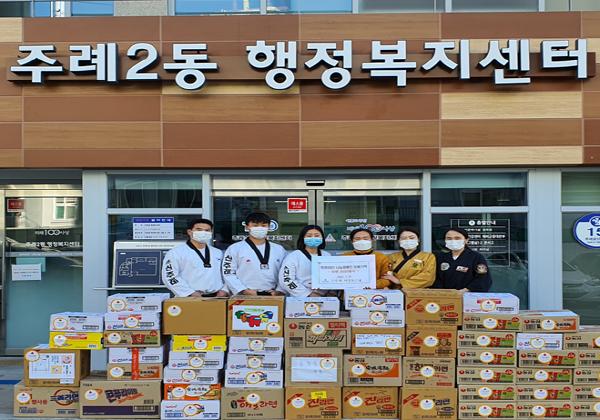 사상구 신주례 태권도스쿨(관장 구범준)은 지난 8일 주례2동 행정복지센터(동장 봉은정)에 라면 2,000개(100만 원 상당)를 기탁했다.