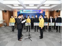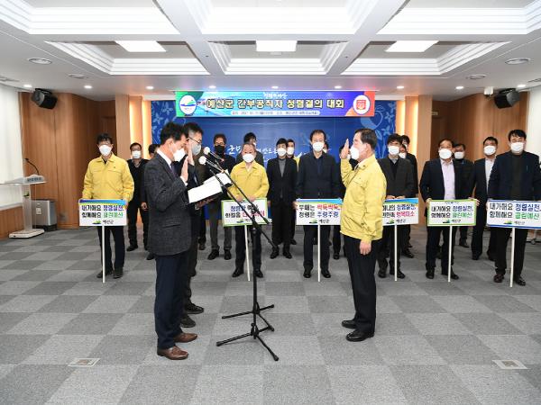 예산군은 11일 진행된 2021년 첫 주간업무에서 간부공직자가 솔선수범해 ‘청렴한 조직문화 구축을 위한 반부패 청렴실천 결의대회’를 열고 힘차게 다짐하며 새해를 출발했다.