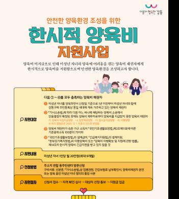 또, 서울시 최초로 ‘한시적 양육비 지원 사업’을 시행하여 양육비 미지급으로 인해 미성년 자녀의 양육에 어려움을 겪는 양육비 채권자에게 한시적으로 양육비를 지원한다. 지원 대상자에게는 미성년 자녀 1인당 월 20만원씩 최대 9개월 지원한다.