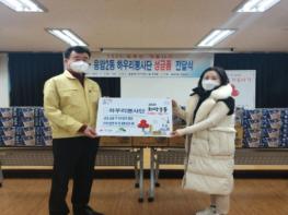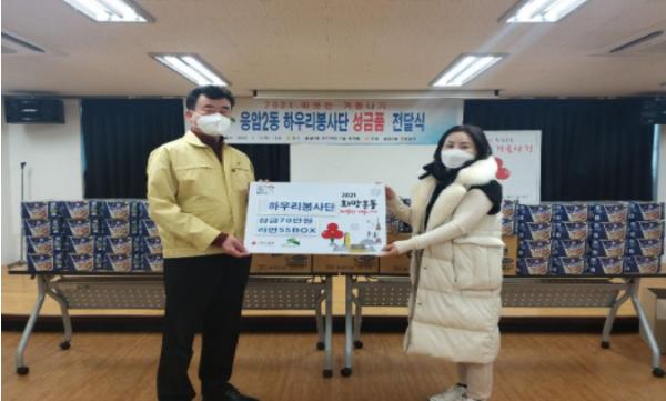 은평구 응암2동 주민센터에서는 지난 1월 7일(목) 오전 10시 응암2동 주민센터 1층 북카페에서 응암2동 하우리봉사단(단장 송지연) 따뜻한 겨울나기 성금품 전달식을 가졌다. 성금 70만원과 라면 55박스를 기부해 주었으며 이날 행사는 손소독제를 비치하고 마스크 착용 등 코로나19 방역수칙을 철저히 준수한 가운데 진행되었다.