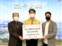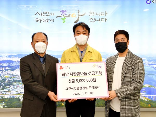 하남시는 지난 11일 그린산업종합건설㈜이 어려운 이웃을 돕는 데 써달라며 성금 500만원을 기탁했다고 밝혔다.