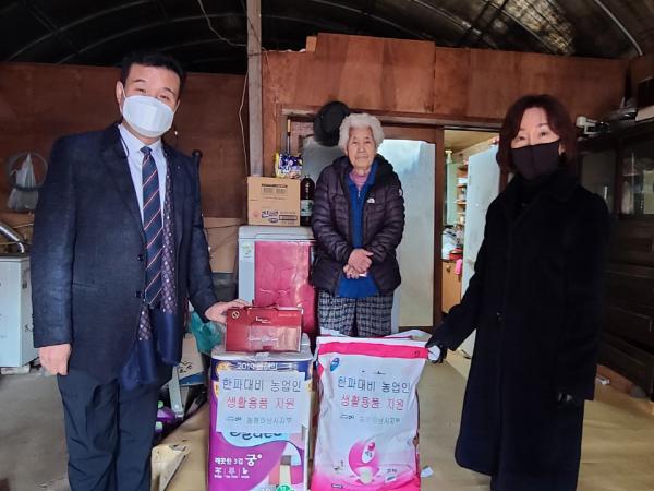 NH농협 하남시지부는 지난 12일 한파와 폭설로 인해 어려움을 겪고 있는 관내 춘궁동 등 취약 농가를 방문해 쌀, 국거리, 생수 등 생필품을 전달했다.