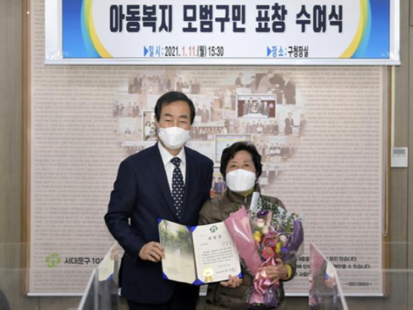 서울특별시 서대문구가 국내 최장기이자 최고령 위탁모 봉사자인 전옥례(75) 씨에게 이달 11일 오후 구청장실에서 아동복지 모범구민 표창을 수여했다.