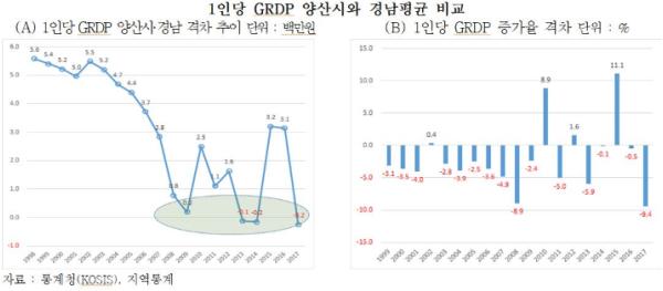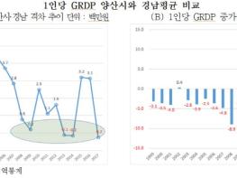 질적 성장을 대변하는 1인당 GRDP를 기준으로 글로벌 금융위기 2007년 전후부터 양산시 지역 성장은 둔화되는 추세로 확인되었고, 1998~2003년 동안은 양산시의 1인당 GRDP가 경남 평균에 비해 5백만 원 이상 높은 소득수준을 유지했으나, 금융위기 이후 빠른 속도로 축소되어 경남 평균 수준을 하회하는 수치를 기록하였다.