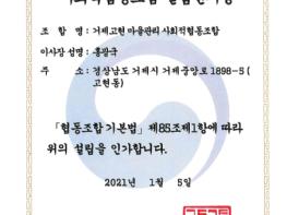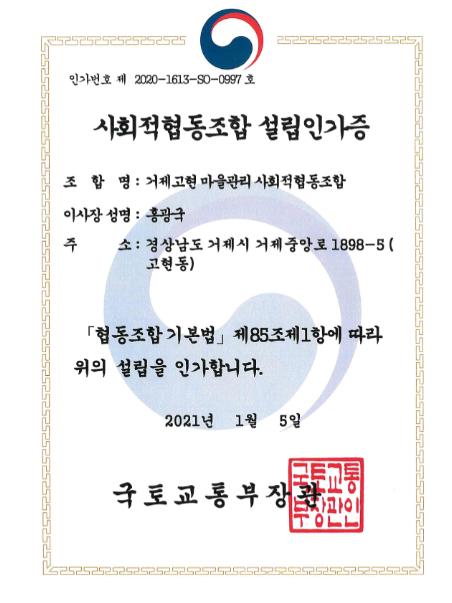 「거제고현마을관리사회적협동조합」이 지난 5일 거제시에서는 2번째로 국토교통부로부터 최종 설립 인가 승인을 받았다.