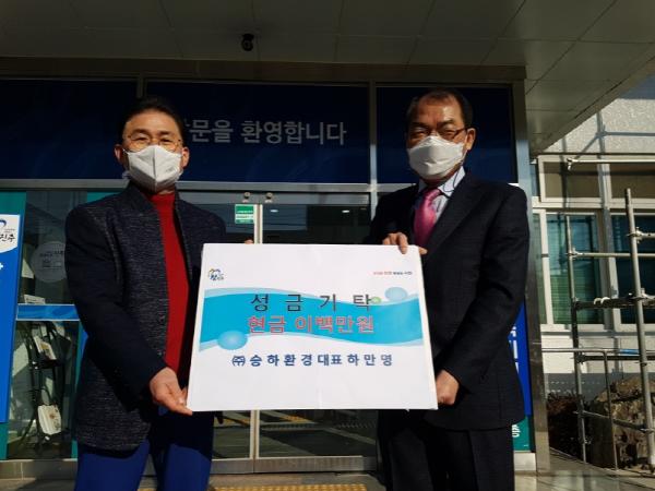 진주시 상대동 소재 ㈜승하환경 하만명 대표는 12일 상대동 행정복지센터에 장학금 200만원을 기탁했다. 이날 기탁된 장학금은 경남사회복지공동모금회를 통해 관내 저소득 학생 10가구에 지급될 예정이다.