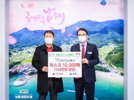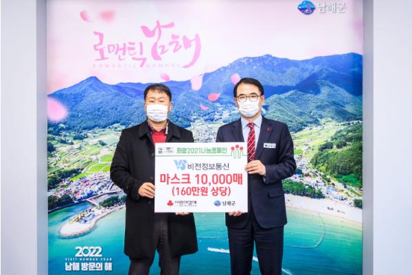 ㈜비전정보통신(대표 문병국)은 11일 남해군을 방문해 코로나19 극복 성품 마스크 10,000매(160만원 상당)를 기탁했다.
