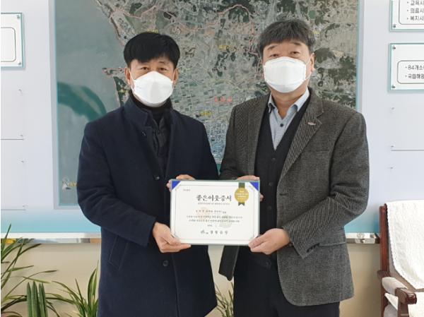 서천군 장항읍(읍장 정진형)은 지난 11일 새해를 맞아 소외된 이웃들을 위해 나눔을 실천한 장미분식(대표 방형자), 영우정보기술(대표 권선우)을 장항읍 좋은이웃 131호, 132호로 선정하고 증서를 전달하였다.