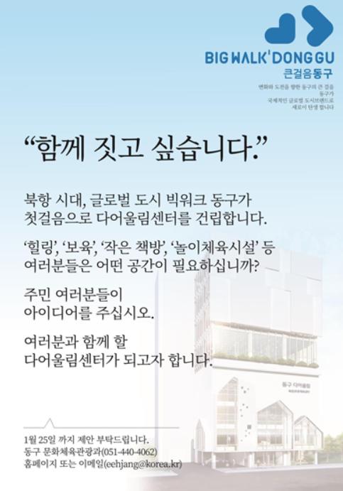 부산광역시 동구는 11일부터 오는 25일까지 ‘다어울림 복합문화체육센터’에 대한 주민의견을 온라인으로 수렴한다고 밝혔다.