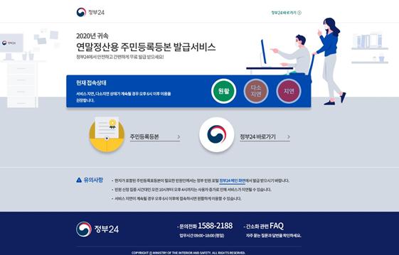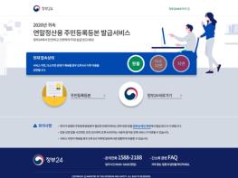 박덕수 행정서비스통합추진단장은 “코로나로 어려움을 겪고 있는 직장인들이 13월의 월급이라 불리는 연말정산을 불편함 없이 마무리할 수 있게 ‘정부24’ 연말정산용 주민등록등본 발급서비스 제공에 차질이 없도록 하겠다.”고 밝혔다.