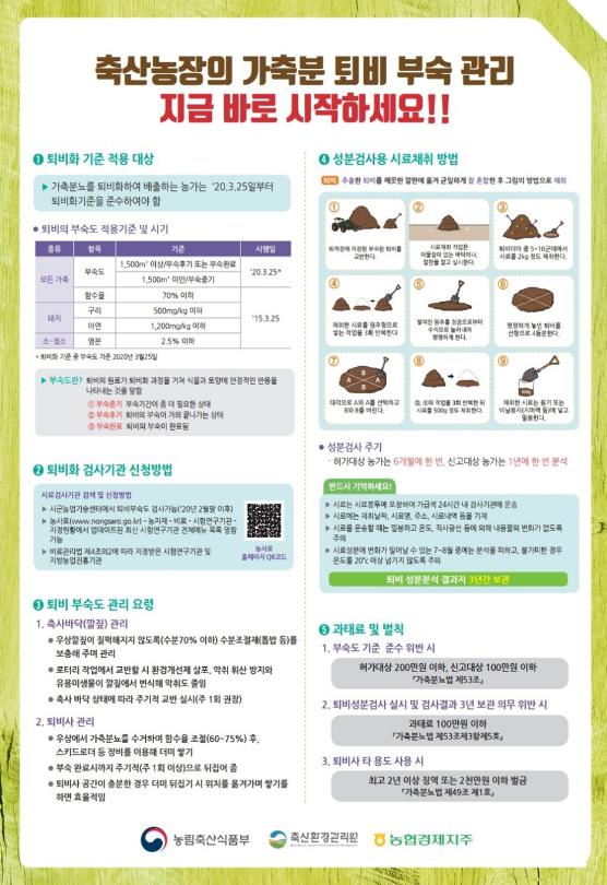 또한 가축분 퇴비를 농경지에 살포 시 축사면적 1,500㎡이상의 농가는 부숙후기 또는 부숙완료된 퇴비를, 축사면적 1,500㎡미만의 농가는 부숙중기 이상의 퇴비를 살포해야 한다. 제도시행 초기 준비가 미흡한 축산농가의 불편을 최소화하기 위해 제도시행 후 1년간은 계도 위주로 시행했으나, 오는 3월 24일로 계도기간이 종료됨에 따라 2021년 3월 25일부터는 가축분뇨 퇴비 부숙도 검사제도가 본격적으로 시행되며, 부숙도 기준 위반 시에는 최대 200만원 이하의 과태료 처분을 받을 수 있으며, 퇴비성분검사 미 실시 및 검사결과 3년 보관 의무 위반시 100만원 이하의 과태료 처분을 받을 수 있으므로 반드시 농업기술센터에 부숙도 검사 의뢰한 퇴비 중 부숙도 기준을 충족한 퇴비만 배출해야 한다. 다만, 축사에서 발생되는 분뇨의 100%를 퇴비생산업체와 위탁 계약하여 처리하는 농가는 해당되지 않는다.