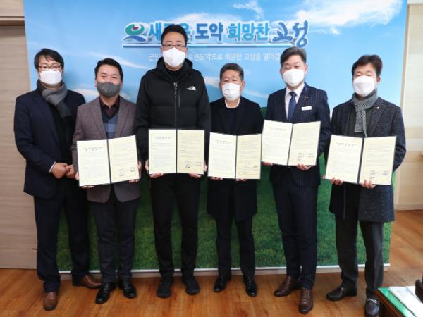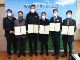 백두현 고성군수, 백찬문 고성군체육회장, 박재우 대한숙박업중앙회 고성군지부장, 황영국 한국외식업중앙회 고성군지부장, 배구종목 전지훈련 선수단 대표 박종찬 홍익대학교 배구단 감독은 1월 12일 고성군청 군수실에서 ‘군민과 선수단 모두가 안전한 동계전지훈련 운영을 위한 협약식’을 가졌다.