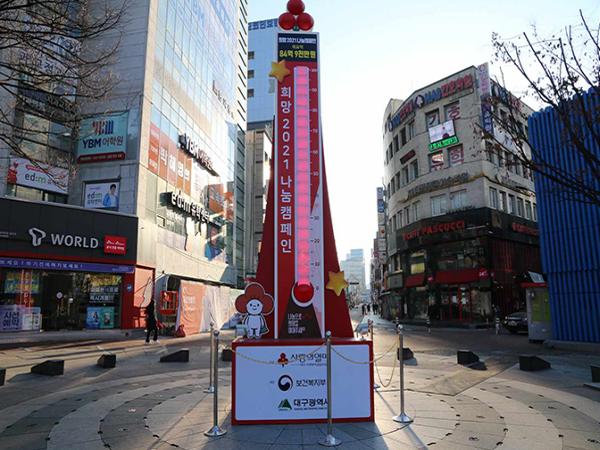 84억9천만을 목표액으로 지난해 12월 1일 시작한 대구 ‘희망2021 나눔캠페인’에서, 2021년 1월 11일 현재 86억7천만원이 모금되어 캠페인 시작 42일만에 사랑의 온도 100도를 달성했다.