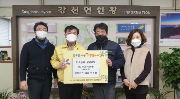 지난 11일 ㈜강천전기(대표 이준형)에서 지역의 소외계층과 함께 코로나 및 추운 겨울을 함께 이겨내고자 하는 따뜻한 마음을 담아 이웃돕기 성금 200만원을 강천면에 기탁했다.