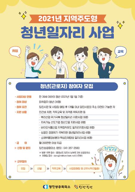당진시는 다음달 5일까지 ‘2021년 지역 주도형 청년 일자리사업’ 참여할 기업과 청년 35명을 모집한다고 13일 밝혔다.