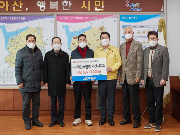대한노인회 아산시지회가 12일 아산시를 방문해 ‘희망2021 나눔 캠페인’ 성금 561만원을 전달했다.