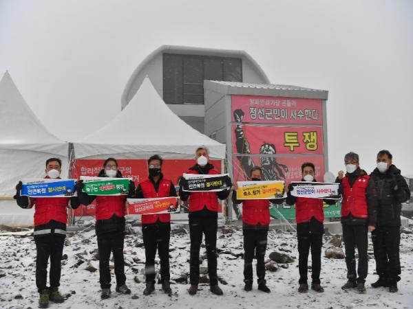 최승준 정선군수는 최근 전국을 강타한 북극발 한파속에서 목숨을 걸고 정선 알파인경기장 합리적 복원을 요구하며 대정부 투쟁을 이어가고 있는 투쟁위와 고통을 함께 나누기 위해 12일 가리왕산 하봉 정상 투쟁 현장을 찾았다.