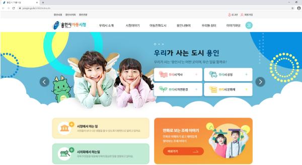 홈페이지는 용인시청 대표 홈페이지 왼쪽 상단의‘용인시 아동시청’을 클릭하면 접속할 수 있으며, 기존 성인 위주의 정보와 서비스에서 벗어나 친근감 있는 디자인과 아동의 눈높이에 맞춘 정보들로 이뤄졌다는 점에서 눈길을 끈다.