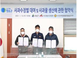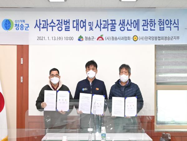 청송군은 지난 13일 군청 소회의실에서 (사)청송사과협회 및 한국양봉협회 청송군지부와 「사과수정벌 대여 및 사과꿀 생산에 관한 협약식」을 가졌다.