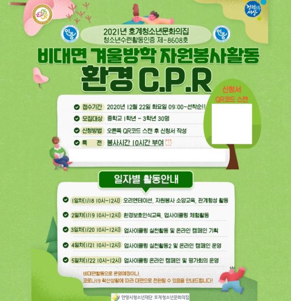 안양시청소년재단 호계청소년문화의집은 1월 18일부터 1월 22일까지 일주일 간 중학생 30명을 대상으로 겨울방학자원봉사 ‘환경 C.P.R’프로그램을 비대면 활동으로 진행한다.