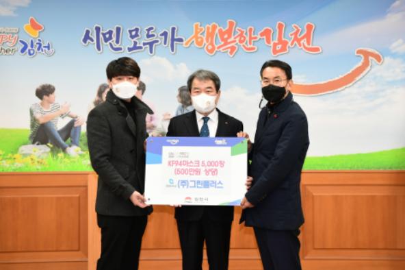 김천시는 그린플러스에서 지난 12일 김천시청을 찾아 500만원 상당의 KF94 마스크 5천장을 전달했다고 밝혔다.