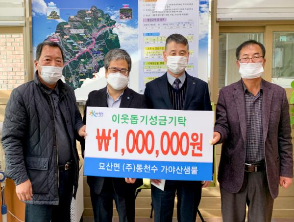 합천군 묘산면 반포마을에 소재한 ㈜동천수 가야산 샘물(대표 박철호)에서 묘산면(면장 홍석천)에 관내 어려운 이웃을 위해 써달라며 성금 일백만원을 기탁했다.
