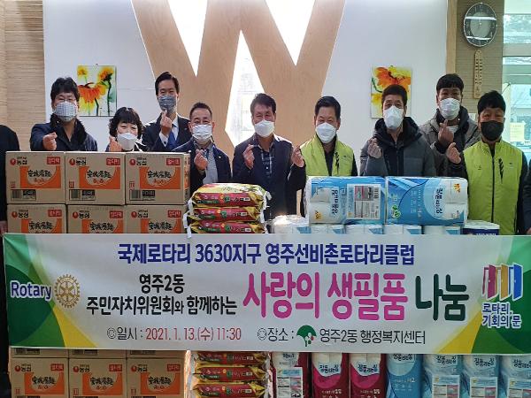 영주시 영주2동 행정복지센터는 지난 13일 영주선비촌로타리클럽(회장 박철수)에서 관내 어려운 이웃들에 전달해 달라며 100만원 상당의 생필품을 기탁했다고 밝혔다.