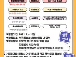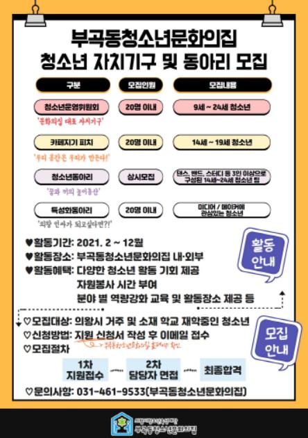 의왕시청소년육성재단 부곡동청소년문화의집에서 2021년 청소년 자치기구와 청소년 동아리를 모집한다.