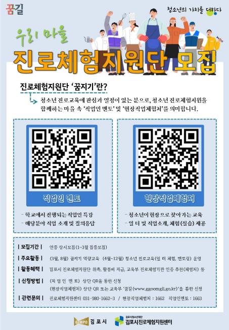 김포시청소년재단(대표이사 이종상) 진로체험지원센터가 마을과 함께하는 청소년 진로교육을 위한 ‘진로체험지원단-꿈지기’를 모집한다.