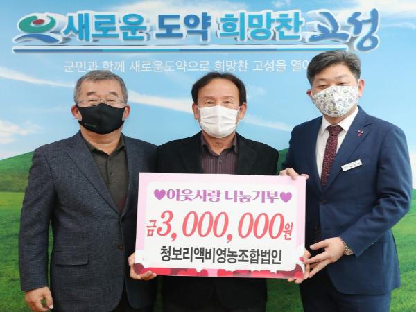 청보리액비영농조합법인은 1월 13일 고성군청을 방문하여 어려운 이웃을 위해 성금 300만 원을 전달했다.