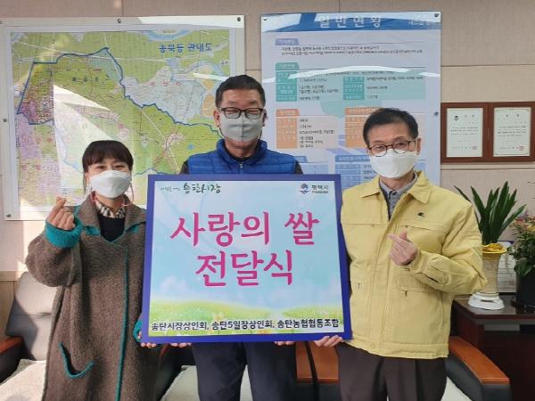 평택시 송탄시장상인회 주관, 송탄5일장상인회와 송탄농협협동조합이 뜻을 모아 도움의 손길이 필요한 이웃들에게 마음을 전하고자 13일 평택시 송북동행정복지센터에 평택 대표 농산물 ‘슈퍼오닝’ 쌀 400㎏(100만원 상당)을 후원했다.