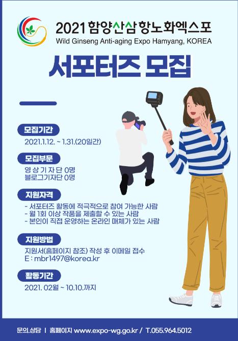 함양산삼항노화엑스포조직위원회는 9월 10일부터 개최되는 ‘2021함양산삼항노화엑스포’를 블로그·유튜브 등 SNS를 통해 홍보할 ‘서포터즈 2기’를 모집한다고 밝혔다.