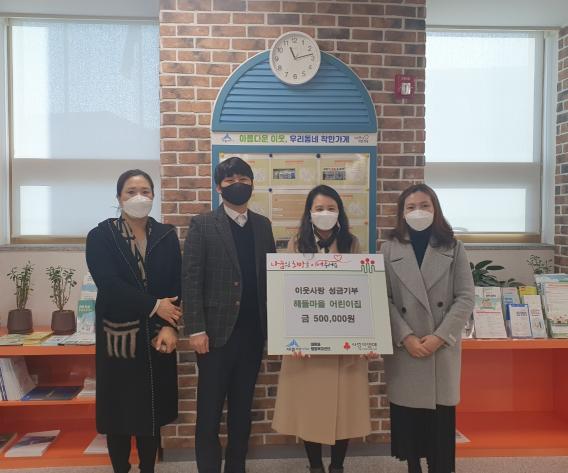 대평동에 위치한 해들마을 어린이집(원장 최윤정)은 13일 대평동 행정복지센터를 찾아 어려운 이웃을 위해 써달라며 성금 50만 원을 기탁했다.