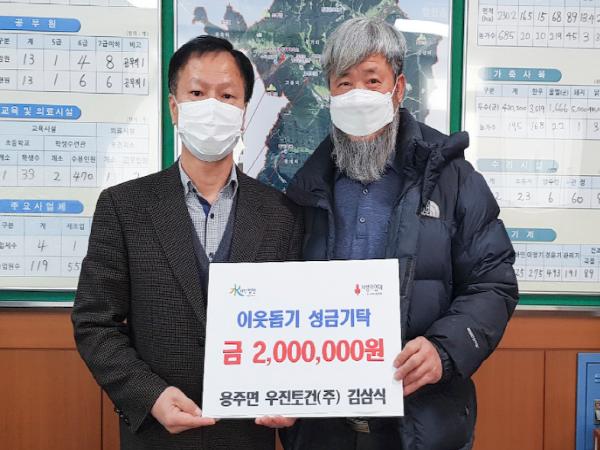 용주면 우진토건(주) 김삼식 대표는 13일, 합천군 용주면사무소를 방문하여 희망2021 나눔 캠페인 이웃돕기 성금 200만원을 기탁했다.