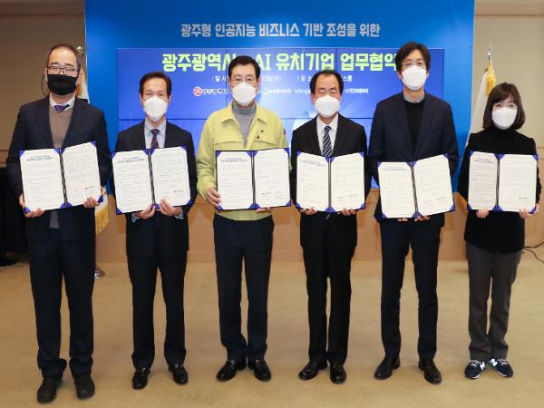 광주광역시는 인공지능(AI) 전문기업인 ㈜데이터스트림즈, ㈜두원메디텍, ㈜아이크로진, ㈜참좋은넷, ㈜파인씨엔아이와 광주형 인공지능 비즈니스 기반 조성을 위한 66~70번째 업무협약을 체결하고 각 기업별 법인설립 또는 지역사무소 설립을 통해 광주 인공지능 생태계 조성에 적극 협력키로 했다.