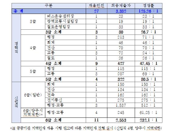 먼저 경력직 채용에서는 16명 모집에 829명이 지원, 52대 1의 경쟁률을 보였다. 이중 5급 행정분야의 경쟁률이 115대 1(1명 모집에 115명)로 가장 높게 나타났으며, 다음으로는 4급 행정분야 71대 1(3명 모집에 213명), 5급 교통분야 69대 1(3명 모집에 207명 지원) 순이었다.