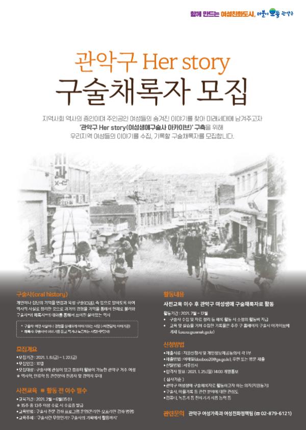 관악 Her Story 구술채록자 모집기간은 오는 22일까지며, 구술사에 관심이 있고 컴퓨터 활용이 가능한 관악구 거주 여성 10명을 모집한다.