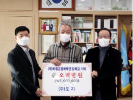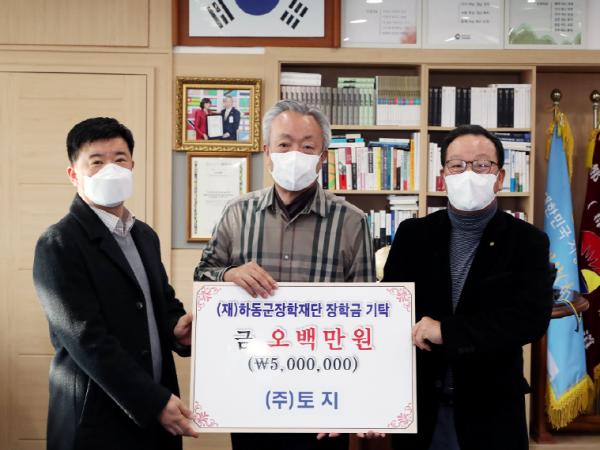 (재)하동군장학재단(이사장 이양호)은 진교면에서 친환경 제품 호안·잔디블럭 등을 전문으로 생산하는 (주)토지 차창고 대표가 지난 13일 군수 집무실을 찾아 장학기금 500만원을 기탁했다고 14일 밝혔다.