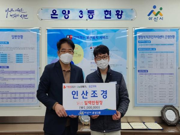 인산조경(대표 박승명, 신동)이 13일 온양3동 행정복지센터(동장 이재성)를 방문해 ‘희망 2021 나눔 캠페인’이웃돕기 성금 100만원을 전달했다.