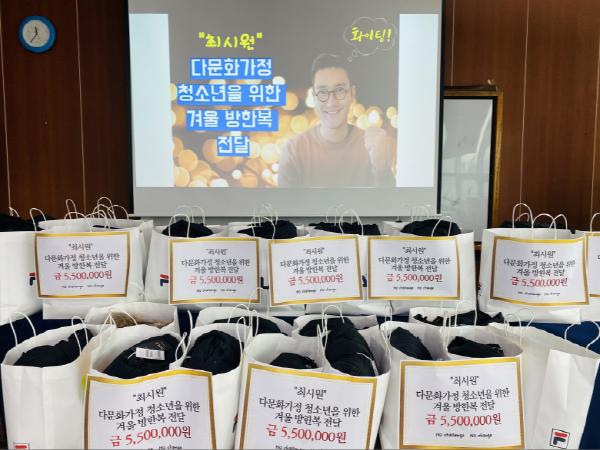 고양시 다문화가족지원센터에 전달된 겨울 방한복은 코로나19로 힘든 시기를 보내고 있는 다문화가정 청소년 40명에게 최시원 씨가 보내는 영상 응원 메시지와 함께 전달됐다.