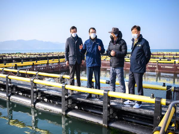 남해안 일대 해안 곳곳에 저수온 주의보가 발령됨에 따라 어업인들의 긴장감이 높아지는 가운데, 장충남 남해군수는 13일 서면·고현·설천면 일대 가두리 양식장을 방문해 현장 상황을 확인하는 한편 어업인들을 격려했다.