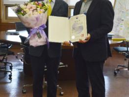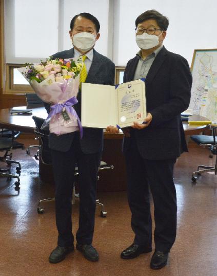시상은 제14대 영통구청장으로 새로 취임한 김용덕 구청장이 상을 대신 전달하며 수상을 축하했다.