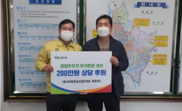 강명완 봉동읍장은 “코로나19 장기화로 어려움을 겪고 있지만 나눔의 손길을 내밀어 준 미래온실산업에 감사드린다”며 “이번 후원물품은 비닐하우스에 거주하는 주거 취약가구에 큰 힘이 될 것이다”며 감사의 마음을 전했다.