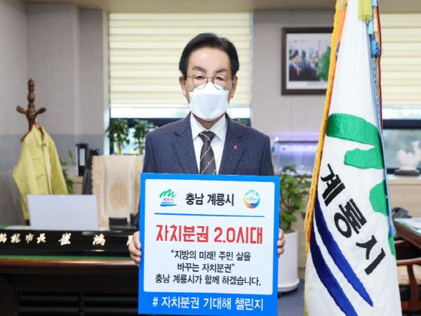 최홍묵 계룡시장이 자치분권 2.0 시대의 개막을 축하하고 주민이 주인되는 지방자치 실현을 위한 ‘자치분권 기대해’챌린지에 동참했다.